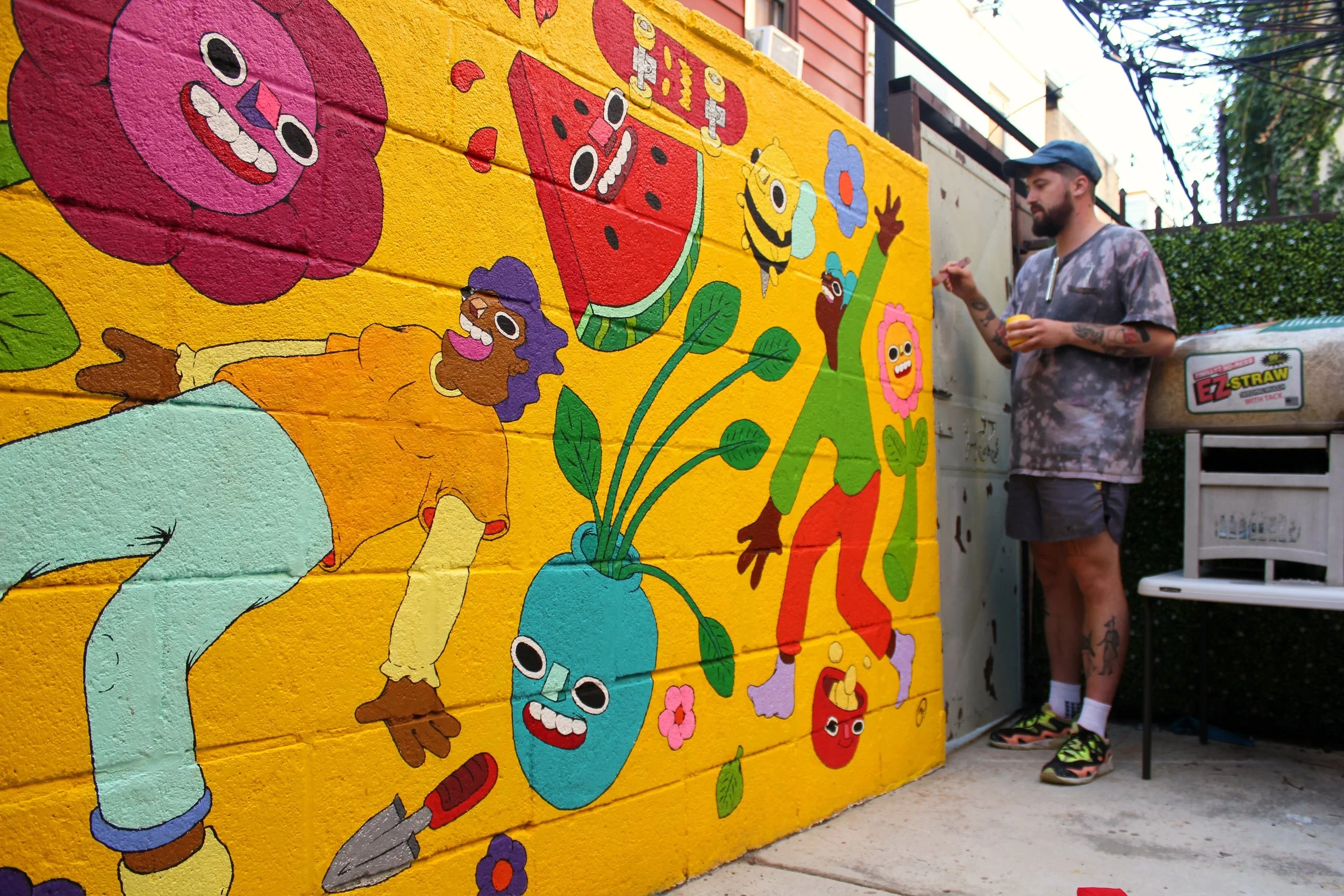 Backyard Paradise! is a private mural for a family that already commissioned me to do two indoor murals. This one was the first step of them renovating their backyard toi be a place for friends, family and joy to have a place to come together.